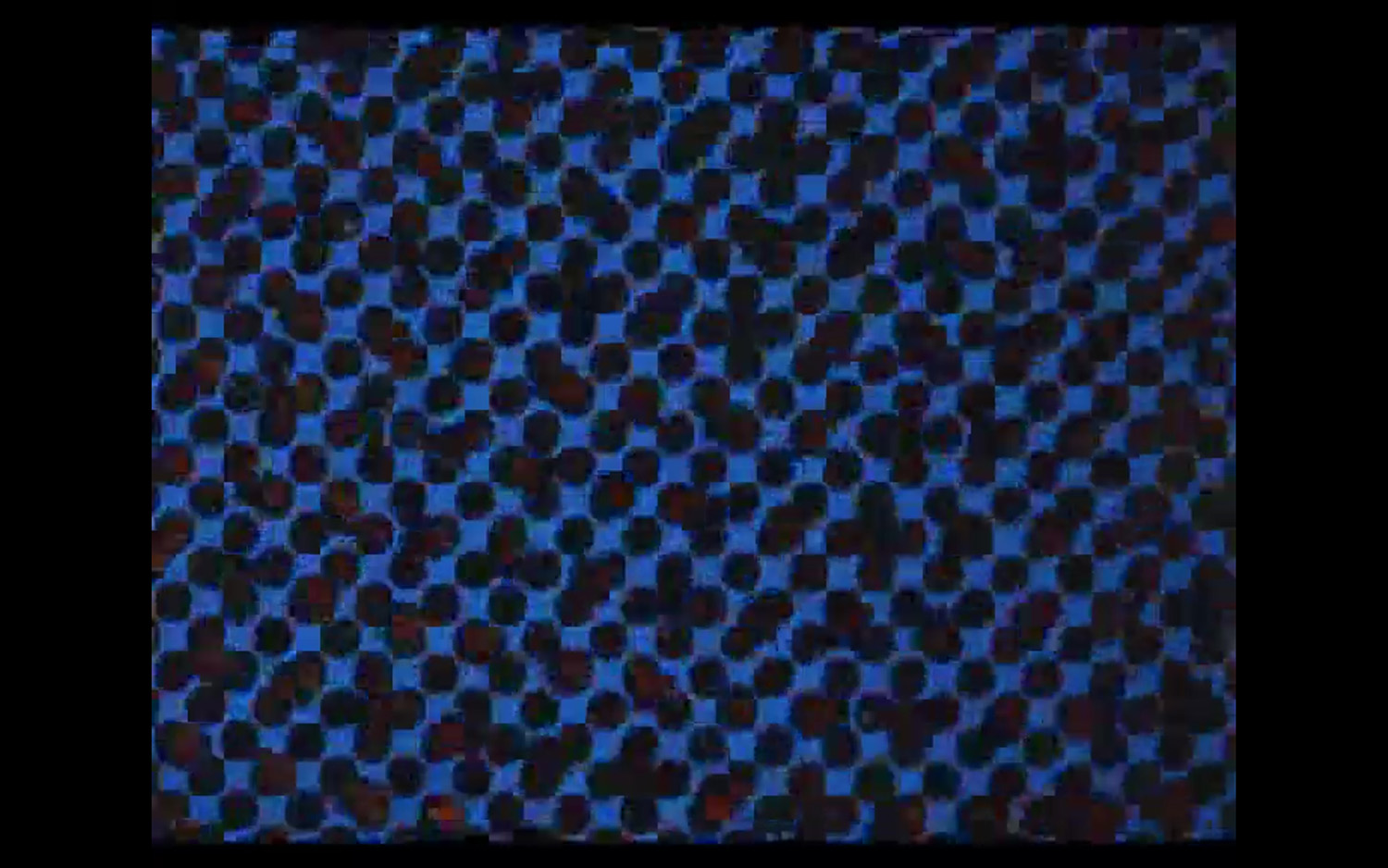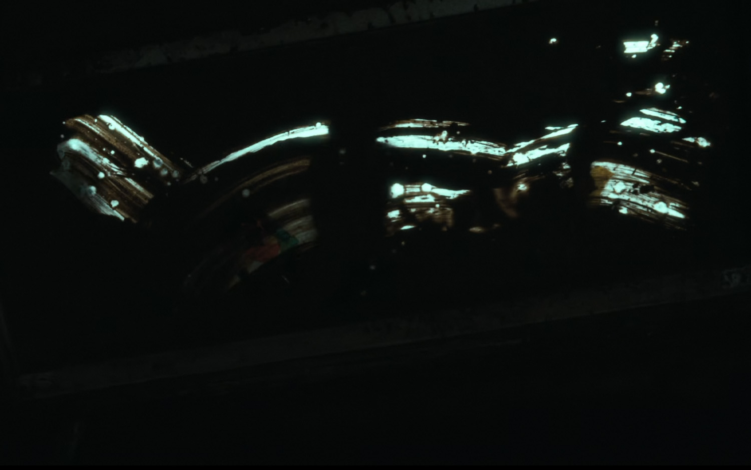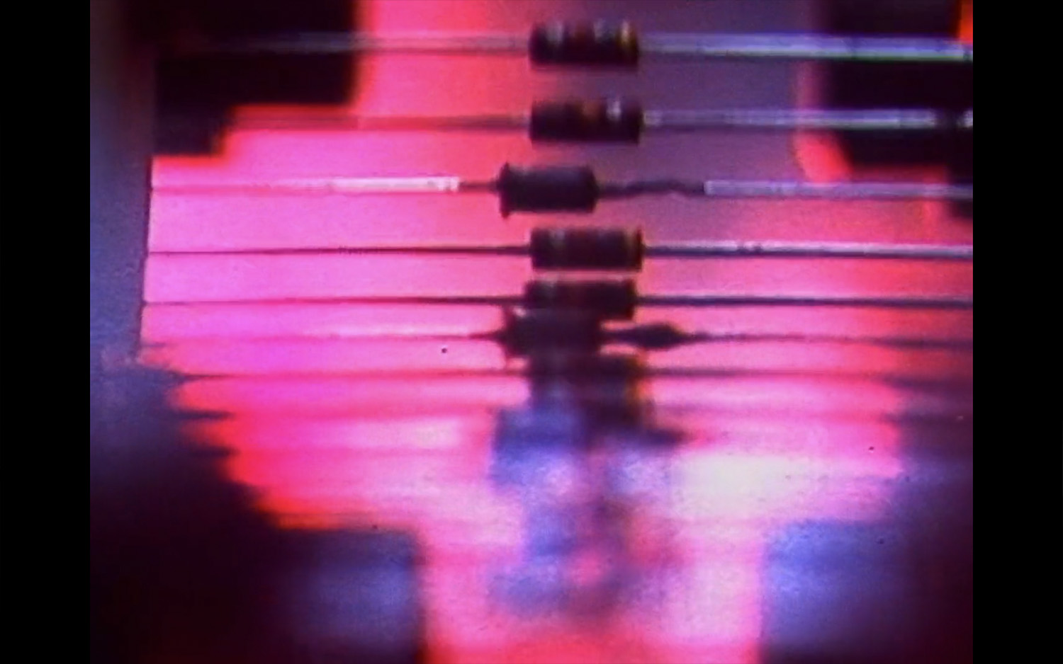 In Dresden Dynamo, there is an interest in the experimentation of aesthetic forms in cinema. The projected images are a result ‐ apparently accidental ‐ of the use of Letraset and Letratone. Lis Rhodes used the Letratone on an blank soundtrack tape, producing a sequence of particular sounds. The result of this experimentation of the material, as well as the audiovisual language, becomes a game of forms in different patterns of colors, sounds and movements. In this way, the rhythm of the geometric images exposed is consistent with the sounds produced by them. The sequentiality of the visual and sound patterns is reproduced continuously without altering the rhythm, playing with the position of the geometric shapes in terms of depth and movement.